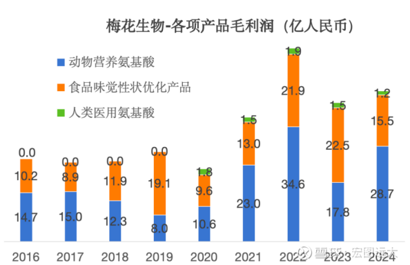 利润方面:如下图所示,动物营养氨基酸2016年14.69亿 → 2024年28.74亿,但毛利率从29.26%下降至19.65%,显示成本压力增大;食味觉性状优化产品从2016年10.23亿增长至2024年15.45亿,但毛利率从21.59%小幅下降至19.45%;人类医用氨基酸整体规模小,2020年表现最佳(1.82亿,毛利率35.19%),但2024年回落至1.22亿(毛利率25.68%)。