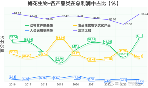 如下图所示:动物营养氨基酸和食味觉性状优化产品的利润占比呈现规律的波动趋势,但是三项主要产品的利润基本占总利润的90%左右。