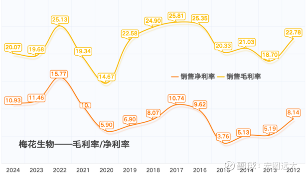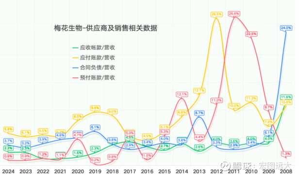 应付账款/营收(黄色折线):整体下降,反映对供应商的付款策略变化,从2012年的26% 波动下降至2024年的5.8%。这个指标意味着每获得100元营收,早期有26元是欠供应商的钱,现在只欠5.8元。表现出,议价能力双向解读:通常,应付账款占比高说明公司能占用供应商资金,体现强势地位。但梅花生物的该指标在下降,可能原因有1)主动选择:为维护与核心供应商的良好关系,选择更快付款以获得更稳定的原材料供应或价格优惠;2)供应商结构变化:可能主要供应商也变得强势,或公司采用了现款结算以获得折扣。结合应收账款极低的情况看,公司并不依赖拖欠供应商款项来维持自身现金流,而是依靠强大的产品销售回款能力,这更是一种健康、强势的体现。