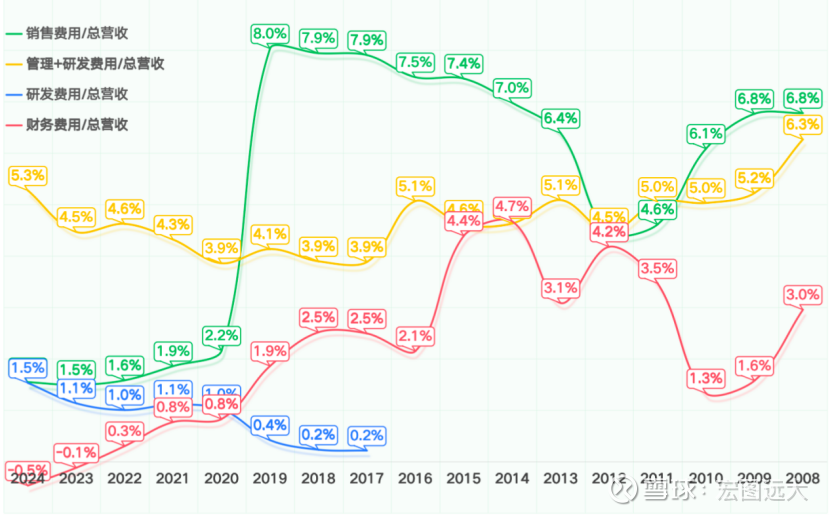 销售费用(绿色折线):体现市场地位和渠道效率的转变,整体呈下降趋势。2008年-2019年,销售费用率整体呈上升趋势,2020年-2024年,销售费用率呈下降趋势。近几年的销售费用下降说明:品牌效应和客户黏性增强+渠道效率提升+产品力加强,产品本身供不应求(这与我们之前分析的“合同负债”飙升的结论完美吻合),销售团队不需要费力推销。