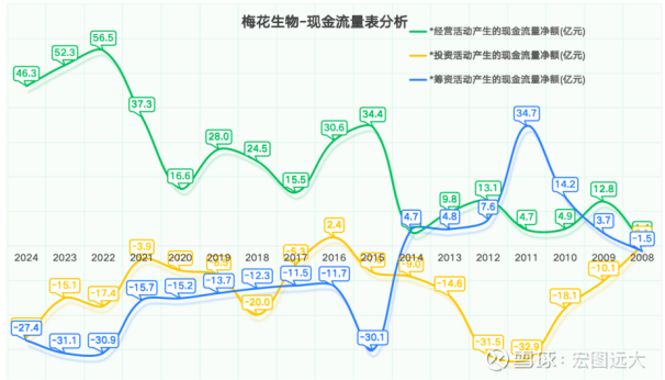 梅花生物的现金流量表讲述了一个关于财务成熟和战略成功的典范故事。过去:公司通过有效的投资布局,建立了强大的产能和竞争力。现在:这些投资进入了收获期,带来了极其强劲的经营现金流。未来:公司利用丰厚的现金回报股东、优化财务结构,并为下一轮的成长进行投资(2023-2024年投资流出增加可能预示新项目)。对于我们投资者而言,这种现金流结构是梦寐以求的: 它意味着公司业务稳固,不需要不断融资稀释股权;它能产生大量现金用于分红;并且管理层在财务上非常自律,专注于为股东创造价值。