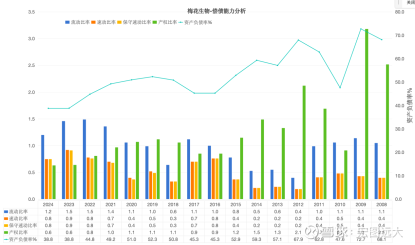 资产负债率(负债/资产):衡量长期偿债能力和财务杠杆的核心指标。近年来稳定在39%左右的水平,通常认为,资产负债率在40%-60% 属于健康范围,梅花生物的负债率处于该区间的下限,表明公司财务政策保守,长期偿债能力强,财务风险低。与历史对比,例如2014年高达59.3%,公司已经成功实现了去杠杆,资本结构得到极大优化。
