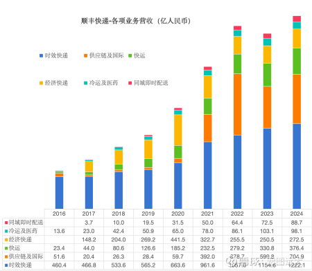 公司主要营收来自“速运及大件业务+供应链及国际业务”,这两项营收占总营收96.4%,其中,时效快递营收占比42%,2024年的营收占总营收的85.82%;
