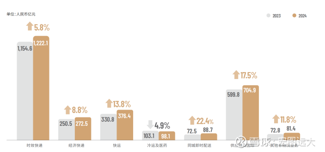 (1)快运:营收增长超过16倍,23.4亿→376.4亿,占比从4.1%提升至13.2%。已成为支撑营收的第三大支柱,受益于大件电商和供应链物流需求;