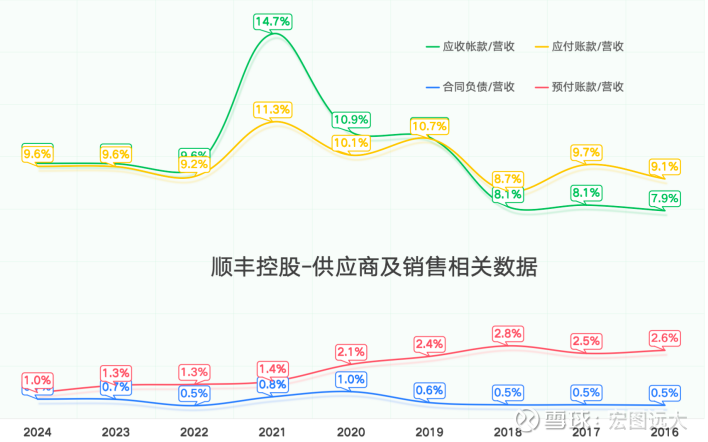 应收账款/营收(绿色线):表示从“强势方”转向“服务方”;趋势:2016—2021年持续上升7.9% → 14.7%,显示公司回款能力对客户议价权减弱,大概率原因是这期间,随着国内网购的快速发展,经济快递持续营收增加,经济快递面临“三通一达”的竞争,导致应收账款增加,这意味着公司正在以资金成本换取市场份额和收入增长;2020年公司主动减少经济快递占比,应收账款出现减少。2022—2024年,基本保持稳定,缓慢增加。