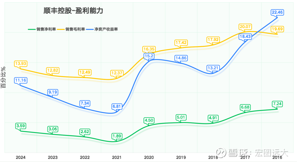 (1) 阶段一(2016-2021):显著下滑与探底。 毛利率从17%一路下滑至12%。这直接反映了公司为寻求增长而进行的战略调整:主动降价竞争:为抢占电商经济件市场,参与市场竞争,部分业务单价承压。新业务投入期:快运、冷运、同城配、供应链等新业务处于大规模投入期,这些业务前期成本高、毛利率普遍低于传统的时效快递,拉低了整体毛利率。成本上升:网络扩大、人员成本、场地租赁等成本持续上涨。
