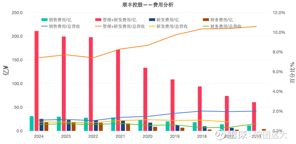 (2) 销售费用率(浅蓝线):从2.0%持续下降至1.1%。这是一个非常积极的信号。它表明顺丰的规模效应和品牌效应越来越强,市场获客成本降低,不需要花费过多的支出就能维持收入增长。