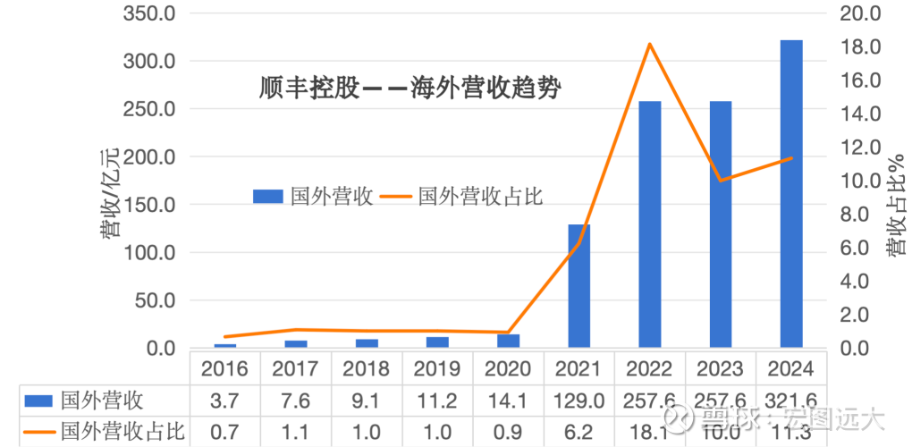 2016年—2020年:此期间是顺丰国际化的探索时期,顺丰的国际业务处于自然增长和初步探索阶段。通过开通国际航线、建立海外办事处、与当地合作伙伴建立关系等方式,初步搭建国际网络。发展节奏:缓慢而平稳发展。海外营收从3.7亿增长至14.1亿,但占比始终在1%左右徘徊。这表明国际业务尚未成为战略重点,主要是为国内核心业务提供配套服务,或试水海外市场。
