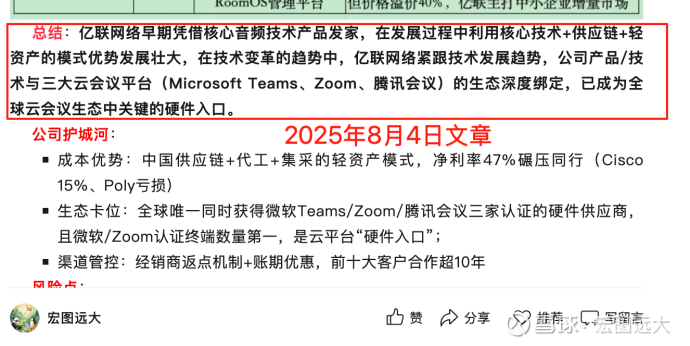 2025年8月4日文章写过亿联网络,当时收盘价33.67元,总市值426.6亿。截至2025年9月17日,收盘股价41.16元,总市值521.32元;近一个半月时间涨幅21.7%。还是挺让人惊讶的。今天再次回顾一下亿联网络的投资逻辑。