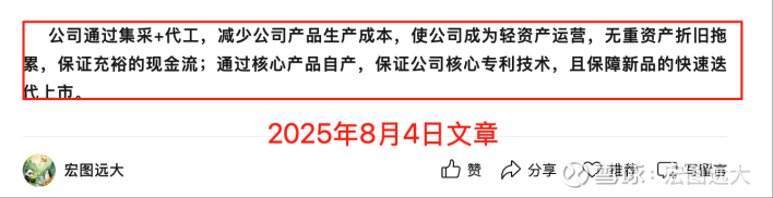 其次分析公司的商业模式,公司财务表现好,只是买入的门槛。只有商业模式好,这个企业的品质好,才值得长期投资,重仓介入。如下图所示,当时的描述是:“公司通过集采+代工,减少公司产品生产成本,使公司成为轻资产运营,无重资产折旧拖累,保证充裕的现金流;通过核心产品自产,保证公司核心专利技术,且保障新品的快速迭代上市”。这种生产模式像不像“苹果”。