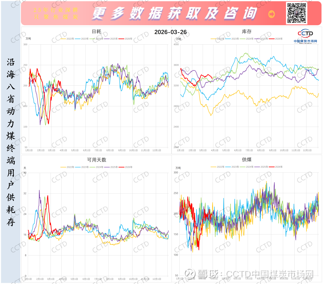 然而,2026年三月份却呈现出不同的走势,在一定程度上表现出“淡季不淡”的特点。根据CCTD高频监测数据,截至3月25日,沿海八省平均日度耗煤量较去年增加4.3%左右。近7天,平均日度耗煤超过200万吨,达到205.9万吨,同比去年增加19.9万吨/天,较2024年增加20.3万吨。从图表走势来看,这一表现也打破了往年稳步下降的趋势。