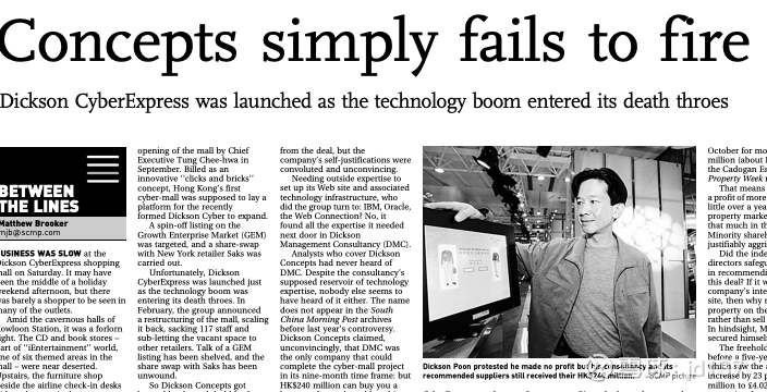 这一交易的披露与批准程序当时就受到了市场质疑。据《南华早报》2001 年的报道,该交易最初被披露为一般“服务协议”,而非关联交易;在交易所提出指引后,公司才重新披露并提交独立股东表决。虽然最终获批,但投资者质疑:为何必须由主席控制的顾问公司来担任承包方,且其指定的供应商必须是设备提供方。David Webb 更进一步指出:如果 DCI 真如其所称具备零售方面的专业能力,股东就不应为主席拥有的顾问公司支付“零售专业知识”费用;对于任何超出 DCI 能力范围的网站开发部分,完全可以聘请独立第三方。同时,他还提到,协议内容中的部分工作——例如在九龙新地铁站上方设立百货商店——是 DCI 过去已经多次做过的事情。