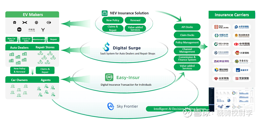 众所周知,我们购买新车是需要上保险的,传统燃油汽车往往都是4s店中的保险代理人来向你售卖汽车保险,但是新能源汽车的销售环节是车厂向你售卖保险,这点不同于传统燃油车。而新能源车厂通过车车的SaaS应用来向保险公司实现一整套的保险售卖过程。这大概就是车车这套数字系统的大概介绍。