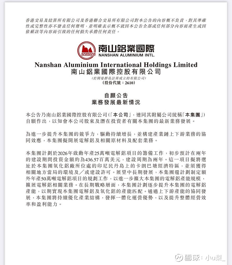 $南山铝业国际(02610)$ $宏达股份(SH600331)$南山铝业国际让我想到了宏达股份,而且是有业绩的宏达股份。南山铝业国际仔细看这个公告倒数第二段话,除了提到的25万吨电解铝在建,50万吨电解铝筹划,远期要实现电解铝跟氧化铝产能匹配,我查了一下1吨电解铝大概需要2吨氧化铝,南山铝业国际氧化铝产能400万吨,那远期电解铝产能就是200万吨,400万低成本吨氧化铝+200万吨电解铝利润上百亿很容易。像不像宏达股份的大饼??估值还不到9pe,提前涨预期不过分吧哈哈哈
