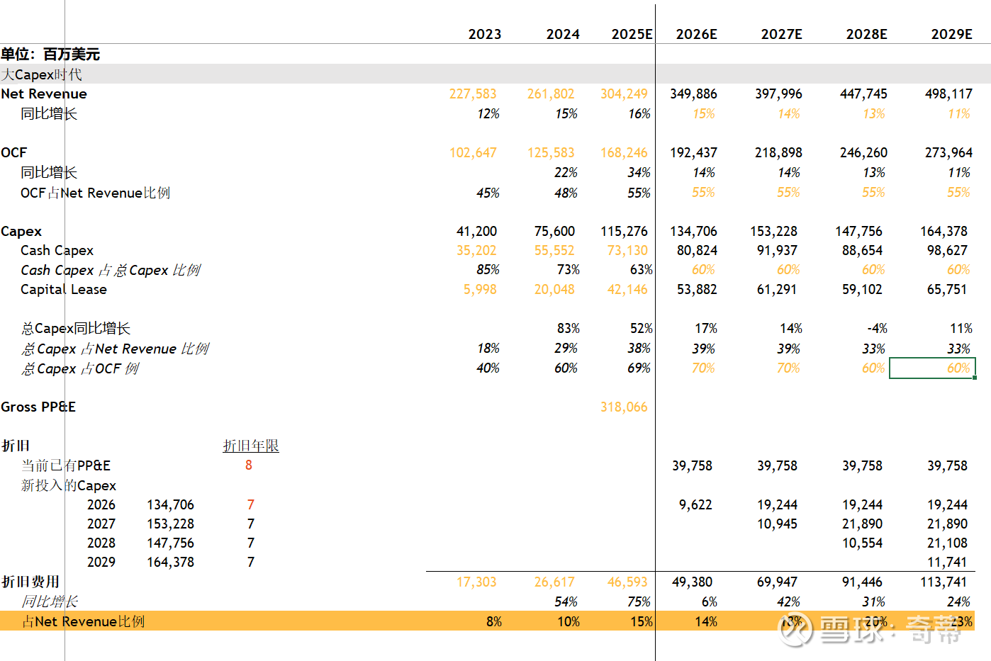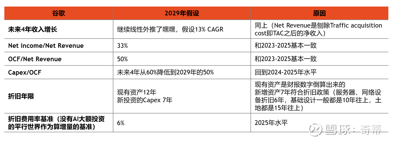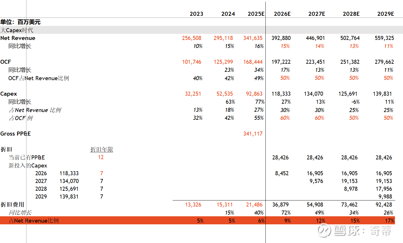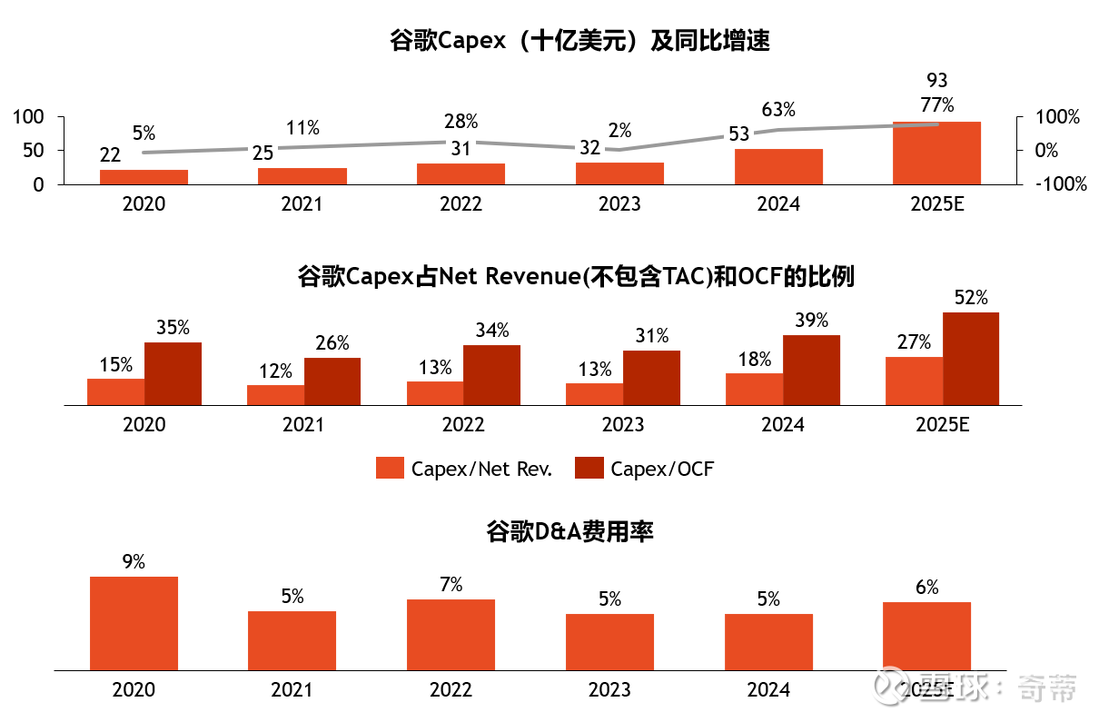 谷歌:2025年Capex/OCF 52%,相比过去几年的30%有显著提升,但D&A费用率尚未体现,在6%左右;