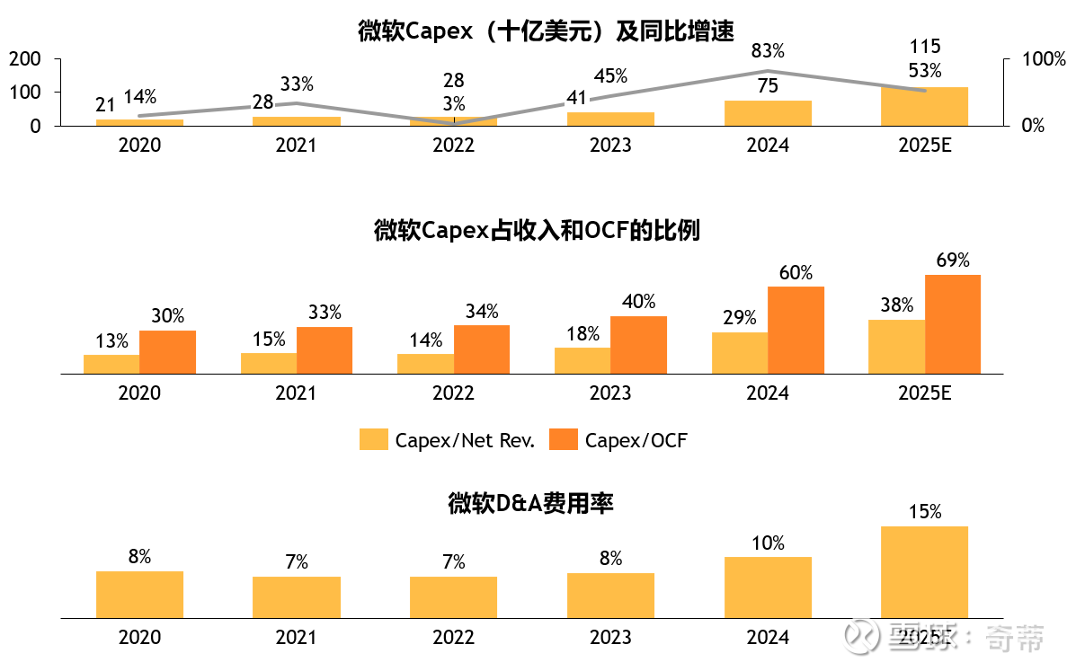 微软:2025年Capex/OCF 69%,相比过去几年的30%左右有显著提升,D&A费用率逐步开始体现,2025预计在15%;