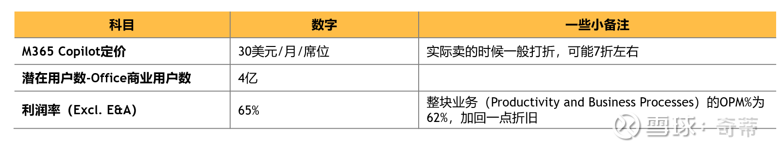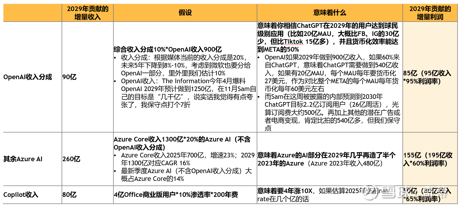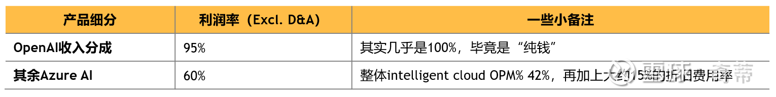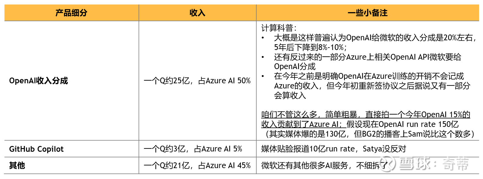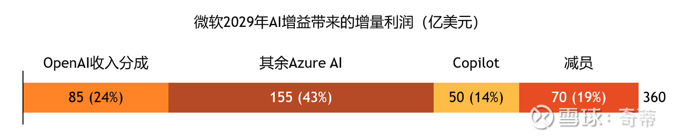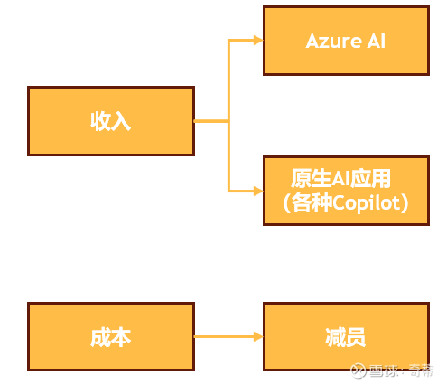 微软:1.收入端Azure AI和原生AI应用,前者包含了微软自己卖的AI服务和OpenAI的收入分成;后者就是M365 Copilot、Github Copilot这些微软推出的Copilot应用;2.而成本端主要体现在生产力提升后需要更少的员工