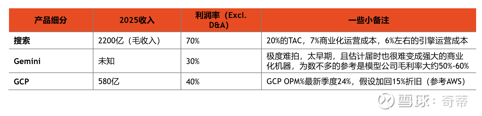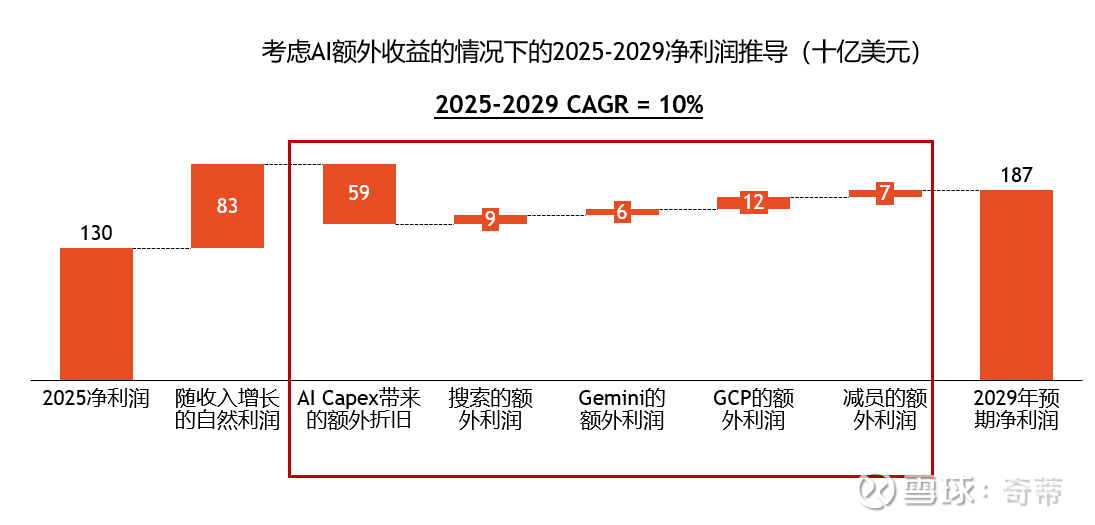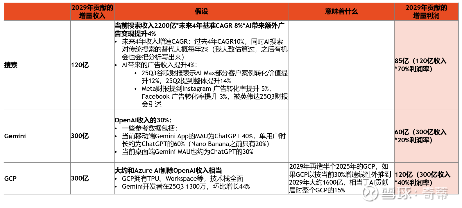 4.来个最终汇总,在“奇蒂”Case下谷歌的未来4年利润大概会长什么样,带来的收益不能完全抵消AI Capex的额外折旧(330亿vs.590亿),净利润未来4年CAGR能做到10%。这里的核心假设其实是GCP和Gemini,这两者对测算影响很大。比如前者的TPU到底带来多大优势?后者未来几年能实现什么货币化空间和利润率水平?现在都还有点看不清,辩论空间很大,但我都不算是很专家,先暂时这么说