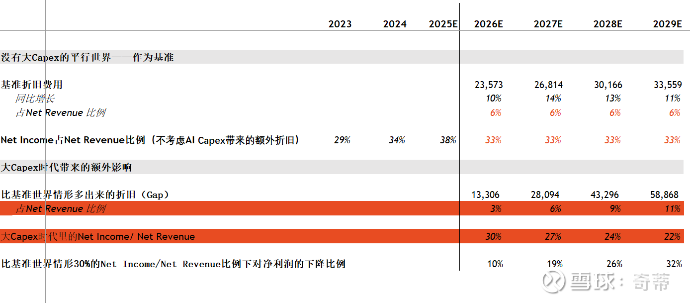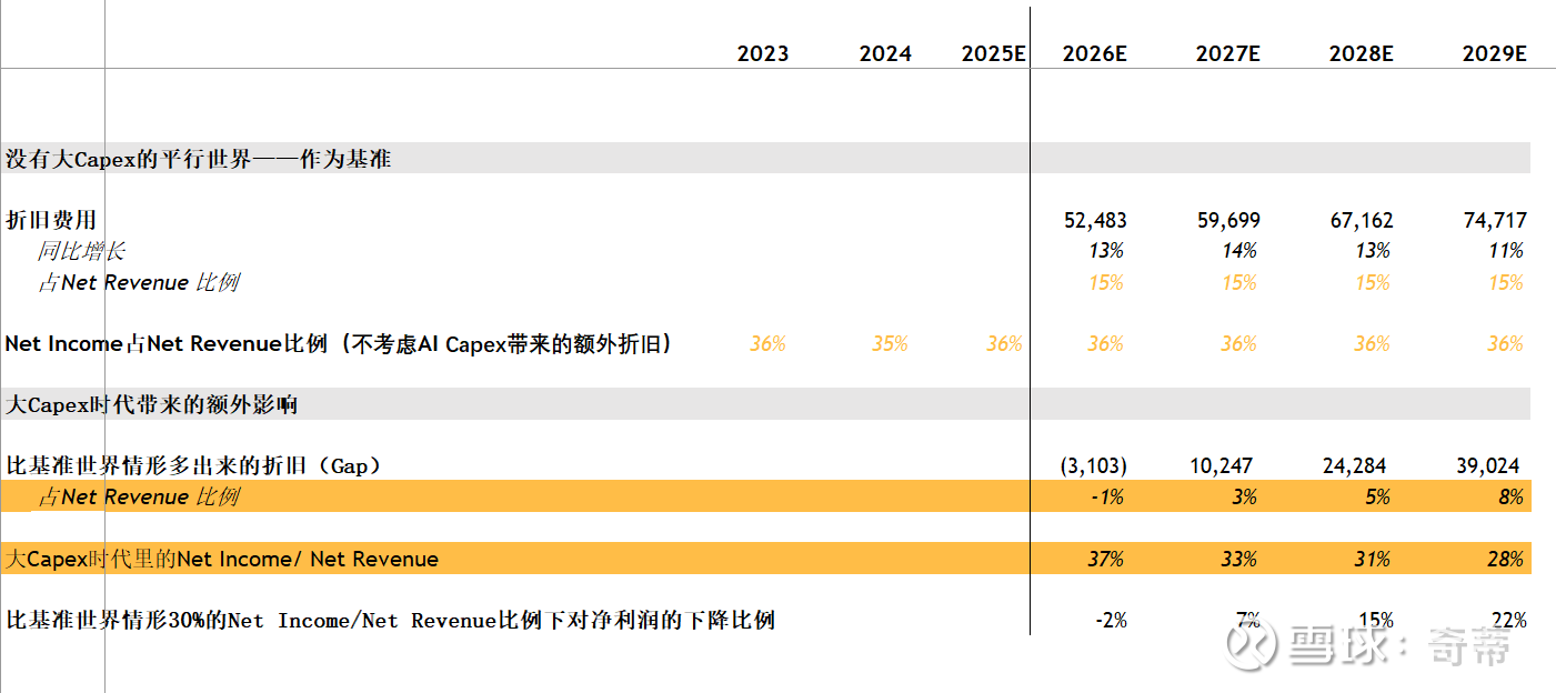 章节2:假设AI的增量收益不存在,现在的Capex会对未来的折旧有多大的影响?(相当于最坏的情况下会如何,Capex带来的折旧已成事实,未来100%会体现在财报上)