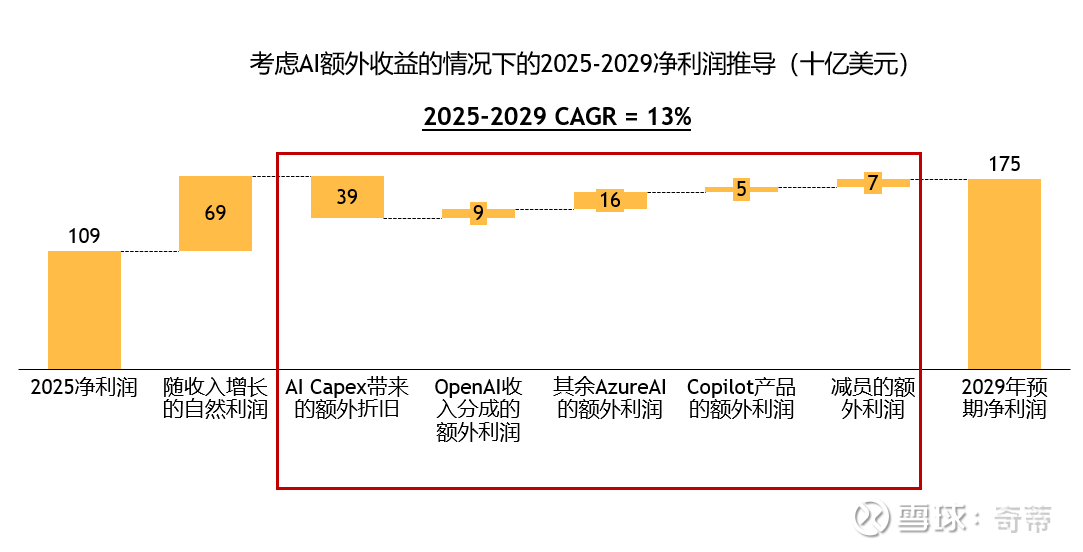 4.来个最终汇总,在“奇蒂”Case下微软的未来4年利润大概会长什么样,AI带来的各种增量利润几乎抵消折旧(360亿vs.390亿),净利润未来4年CAGR能维持在13%