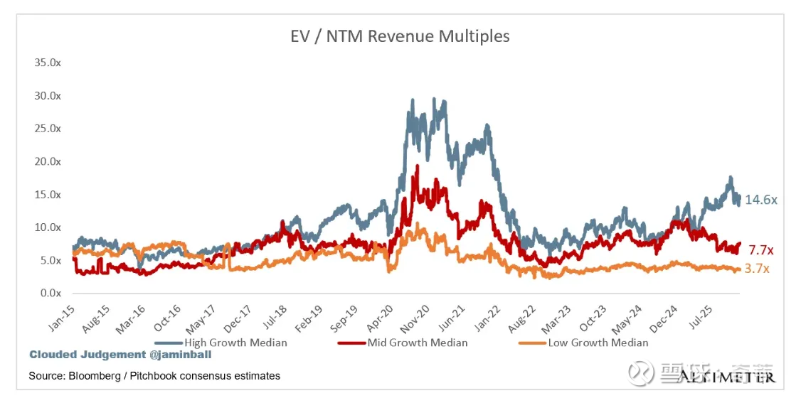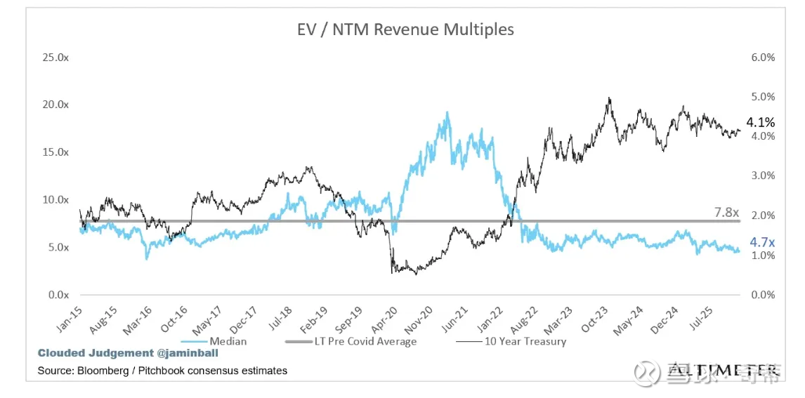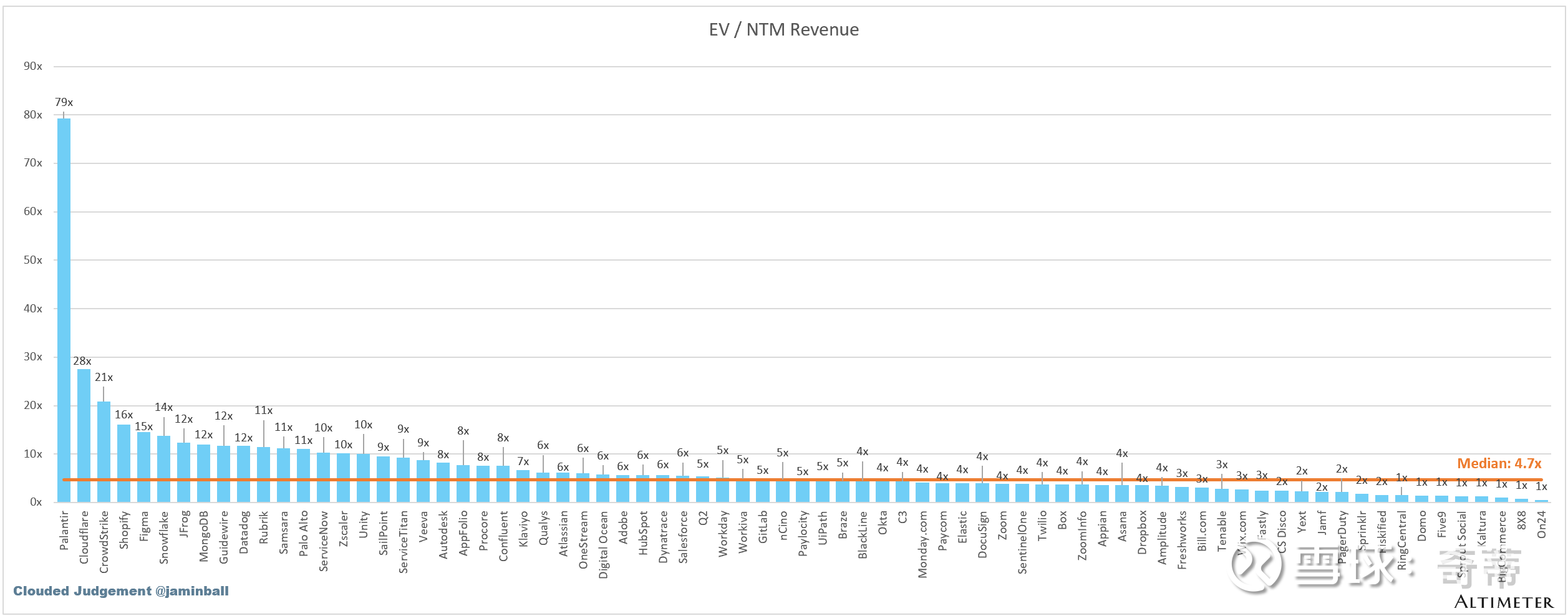 十、从估值上:因为受叙事压制,大概和2022年水平类似,EV/NTM Revenue中位数4.7X,假设隐含利润率15%(其实只有少数公司能达到,不过这类公司EV/NTM)也折合30PE,整个SaaS中位数增速13%,所以整个SaaS依然不算便宜,需要精挑细选(毕竟这么多公司呢)或者“降低估值在投资中的权重”