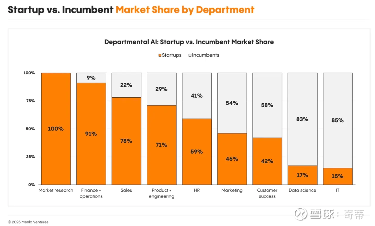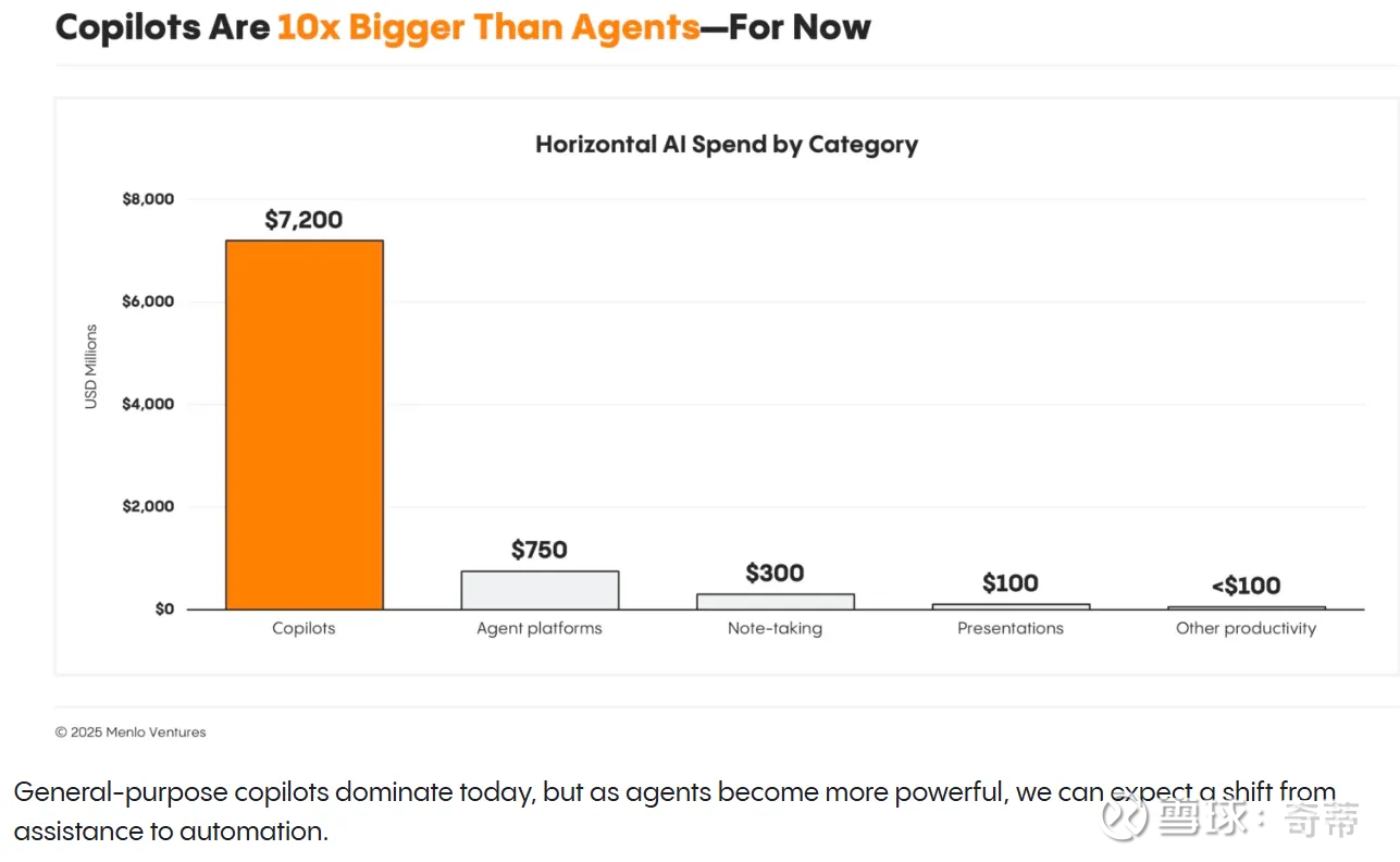 其中Horizontal基本都是Copilot,Departmental中55%是Coding,在其他诸如IT、营销、销售,都是只有几个亿美元的支出,并且其中40%-50%左右流向Incumbents