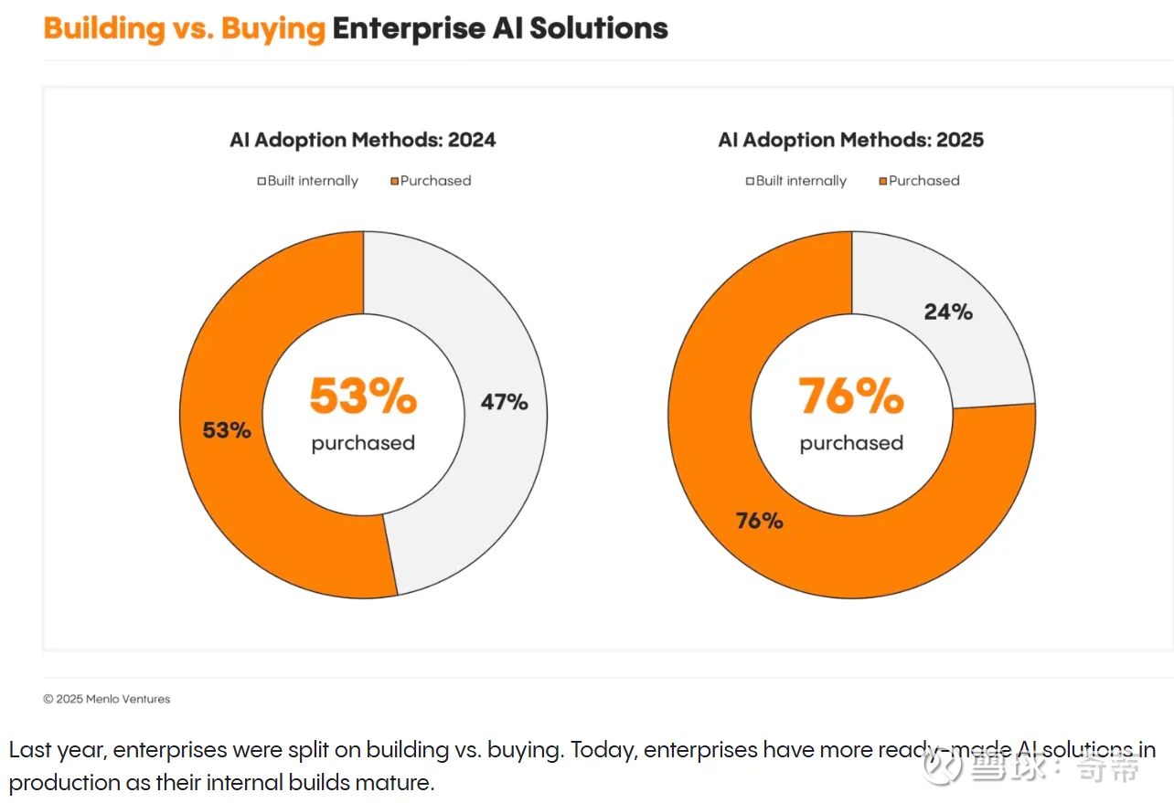 六、这给了客户尝试的时间,也给了给了部分现有软件企业调整的空间。企业的偏好也在逐渐发生变化,对从应用软件供应商采用AI/LLM方案的偏好边际上持续上升(来自调研)