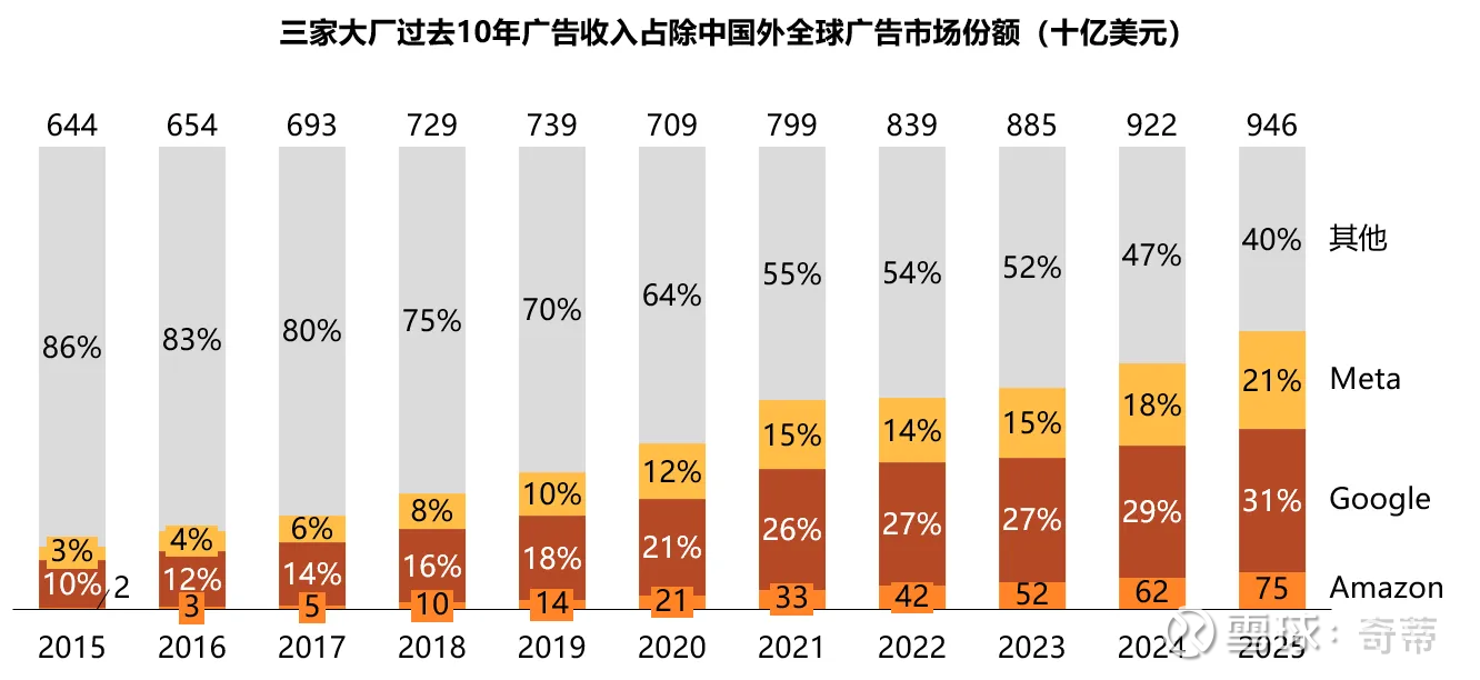 自己估算一下除中国以外的数字广告渗透——3大巨头渗透60%:根据WPP的数据,全球2025年广告支出1.14万亿美元(Cross check这个数据也是合理的,比如Dentsu预计2025年全球广告9900亿,另外2024全球GDP 110万亿,对应1万亿左右广告支出为1% GDP左右也是合理的),中国2100亿美元(占比将近20%),所以除中国外全球大约9300亿美元,GOOGL+META+AMZN 2025年预计广告收入5700亿左右,即3大巨头渗透60%(5700/9300)