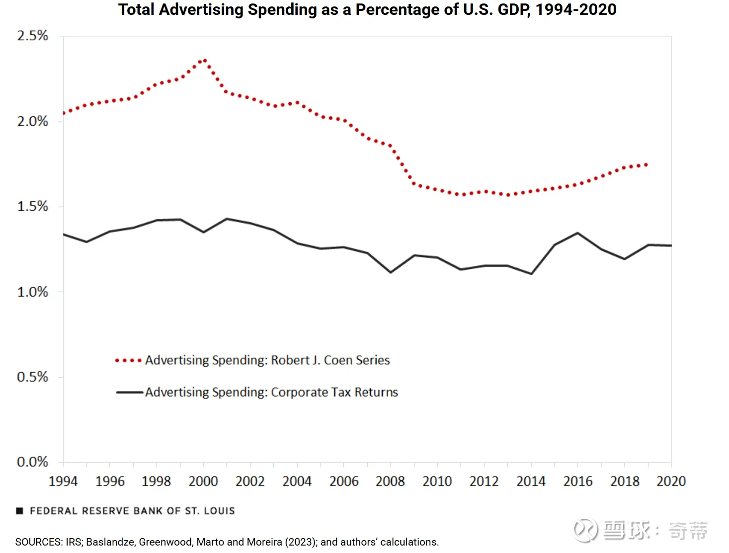 偏官方数据——圣路易斯联储(美国联邦储备系统的 12 家地区性储备银行之一)的研究,用了两个数字口径,一个是行业专家Robert J.Coen的数字,一个是美国企业税务申报口径 (IRS Data,偏权威),均表示美国的广告支出占GDP的比值在过去20年没有显著提升,基本稳定在GDP的1.3%左右