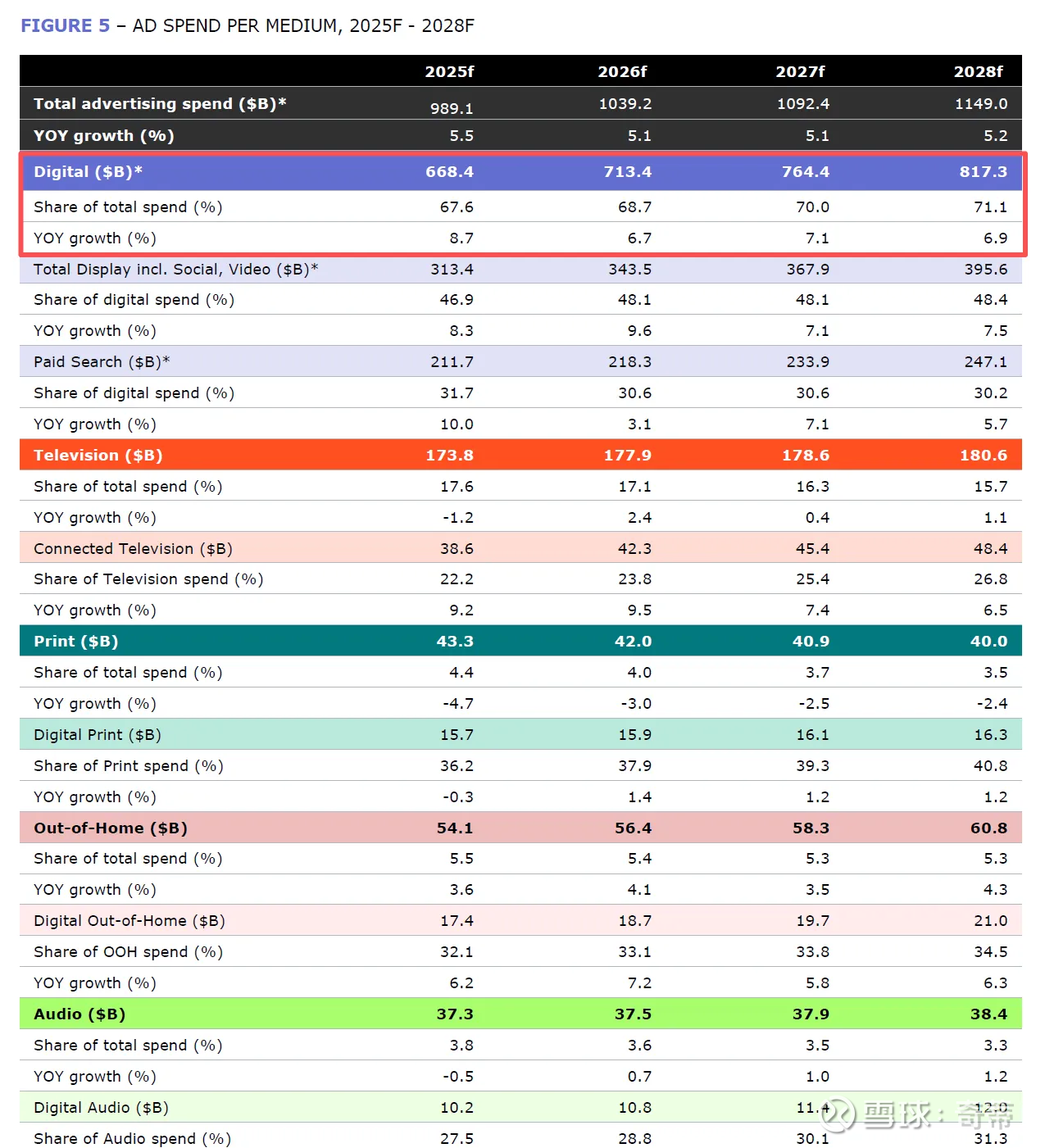 第三方估算也基本对得上:Denstu(日本营销传播集团,年收入90亿美元),认为2025年的数字广告渗透全球达到67%