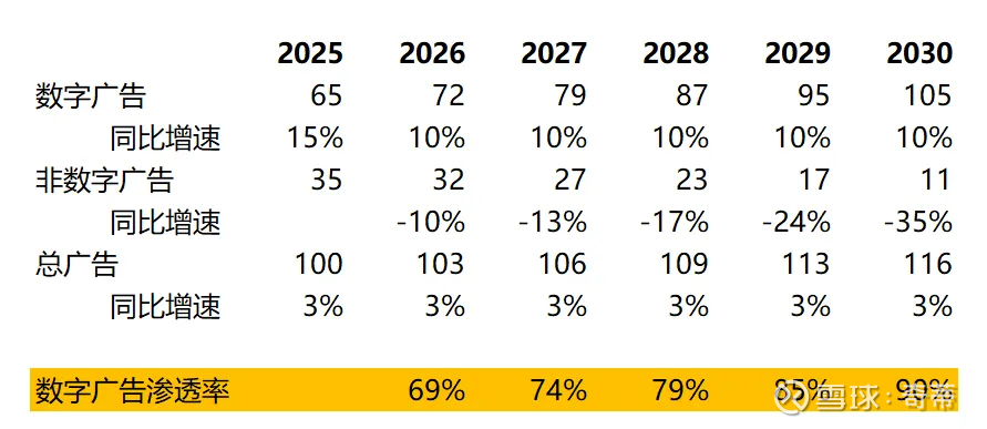 a.最大的感受是,作为移动互联网的原住民,好像已经天然习惯了这些“商业模式好”“治理结构好”“市场足够大”的公认的好公司,做未来预测的时候就“应该”拍个好比未来10年增速10%(包括很多人拍茅台可能也是类似吧),但这真的理所应当吗?目前看未来5年10%的广告收入CAGR足以让数字广告渗透率达到85%进入彻底的存量,再之后呢?我不怀疑巨头还能从当前健康的生态中继续压榨出价值来获得更高或许一个10%+的广告增速,但10年后呢?