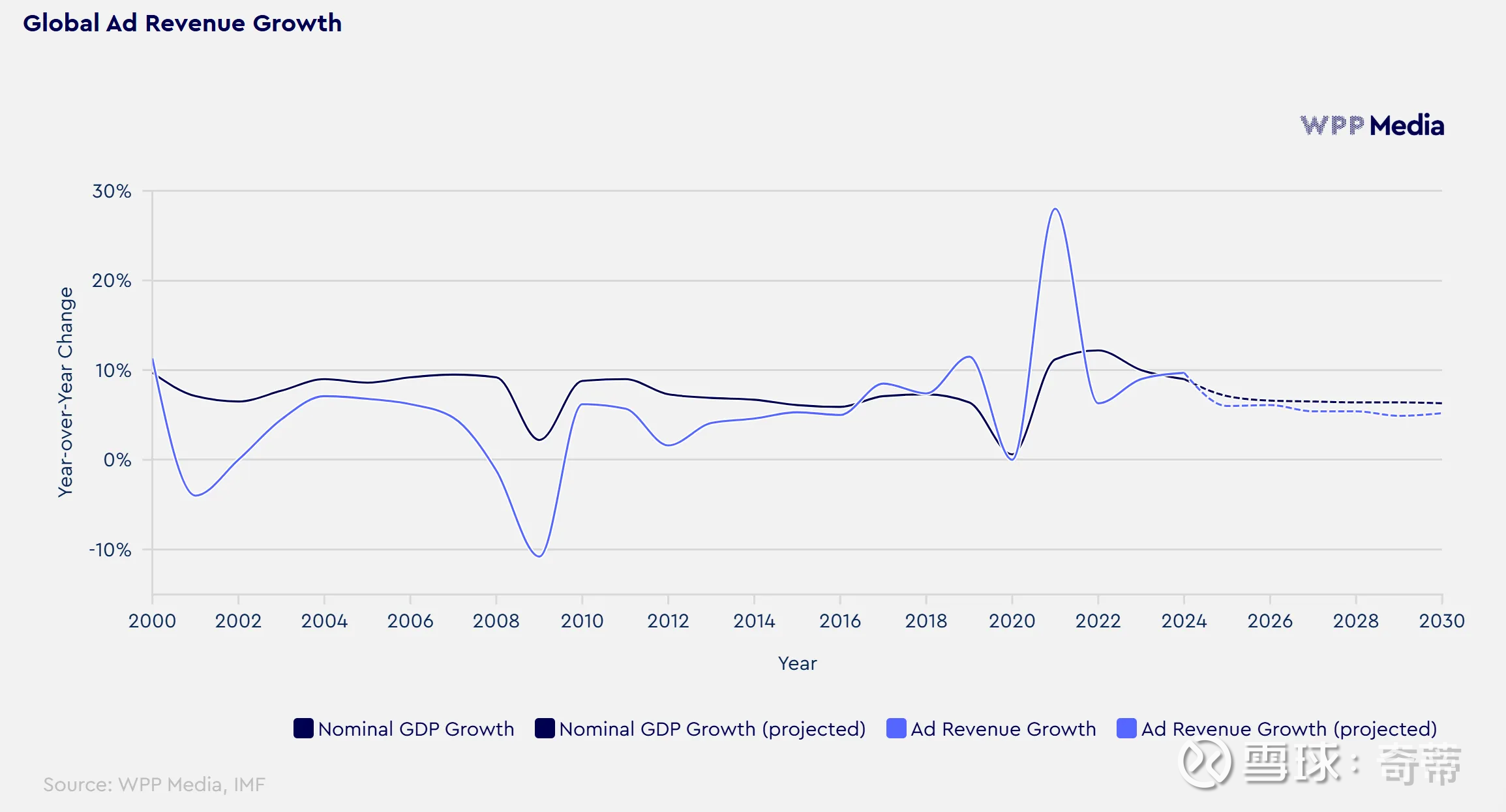 行业内第三方——WPP(全球最大广告控股公司,年收入150亿英镑)的数据为过去25年广告收入增速并没有超过GDP增速
