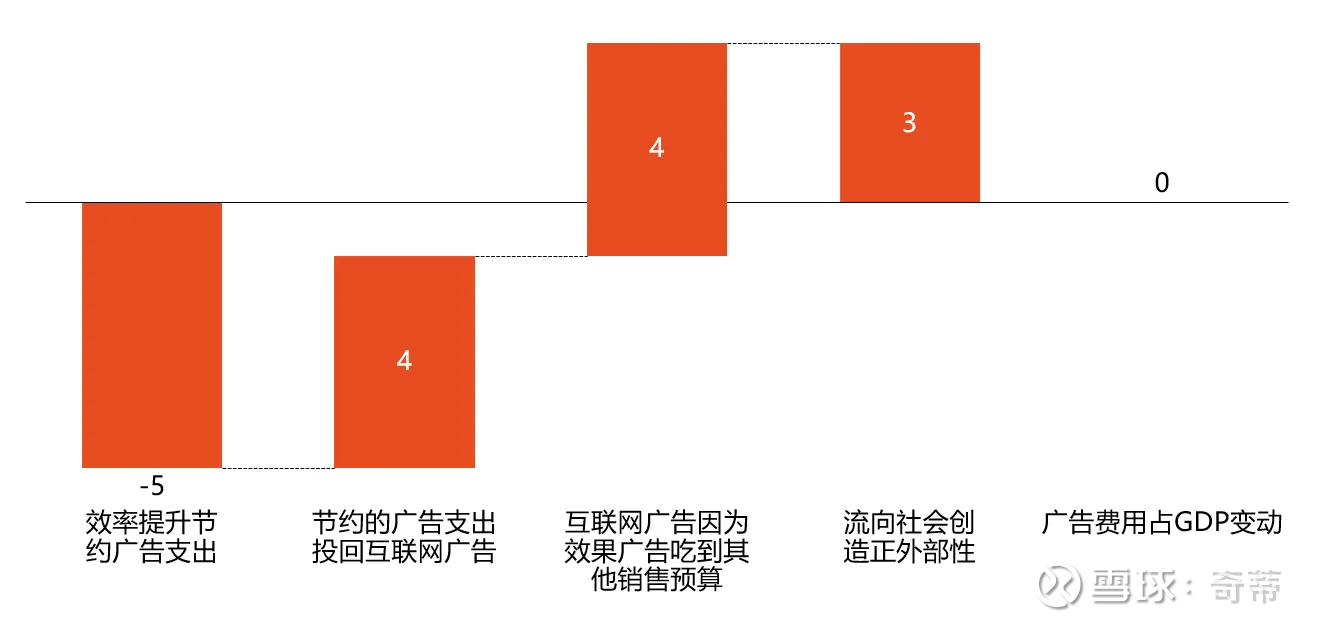 五、如果只是这样那么又违反了一定的常识,互联网作为先进的生产力,当然应该带来的是“效率提高”,整个消费公司的S&M没有减少,那多出来的效率去哪里了?我认为广告效率的提升带来的其实是某种“广告通缩”,即效率提升导致之前的无效广告浪费可以砍掉,实际可以支出更少广告费,但由于互联网平台的商业模式往往较强,有定价权,导致省出来的广告费有2个去向,1.又要重新投回互联网平台。2.让利给社会创造了一定的社会效率提升,即正外部性