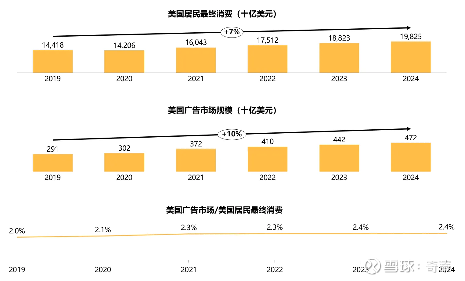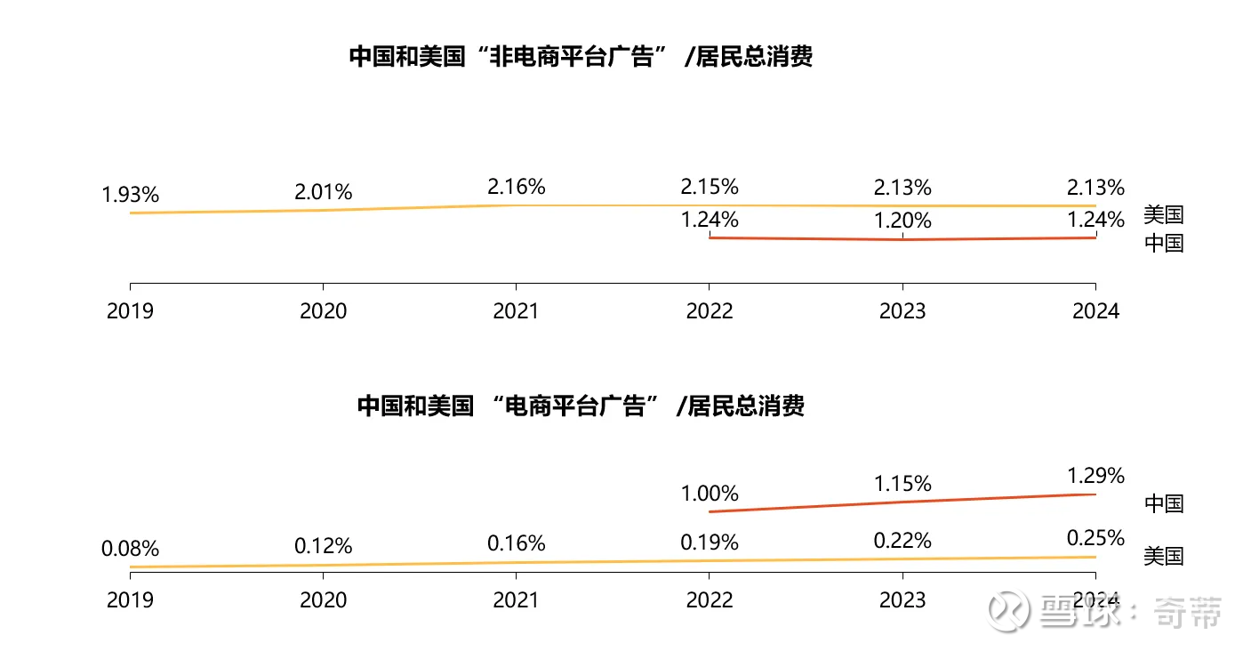 五、所以当我们讨论“广告”的时候,把“除电商平台的全部广告”和“电商平台广告”拆开也许更合适,后者更像是“商场租金”,前者中美都是稳定的,后者中美都是逐步上升的,所以单论广告来说,基本可以定论广告占经济体居民总消费不会大幅波动,你所看到的“广告占总消费上升”其实是“电商平台在涨租金”的一部分现象