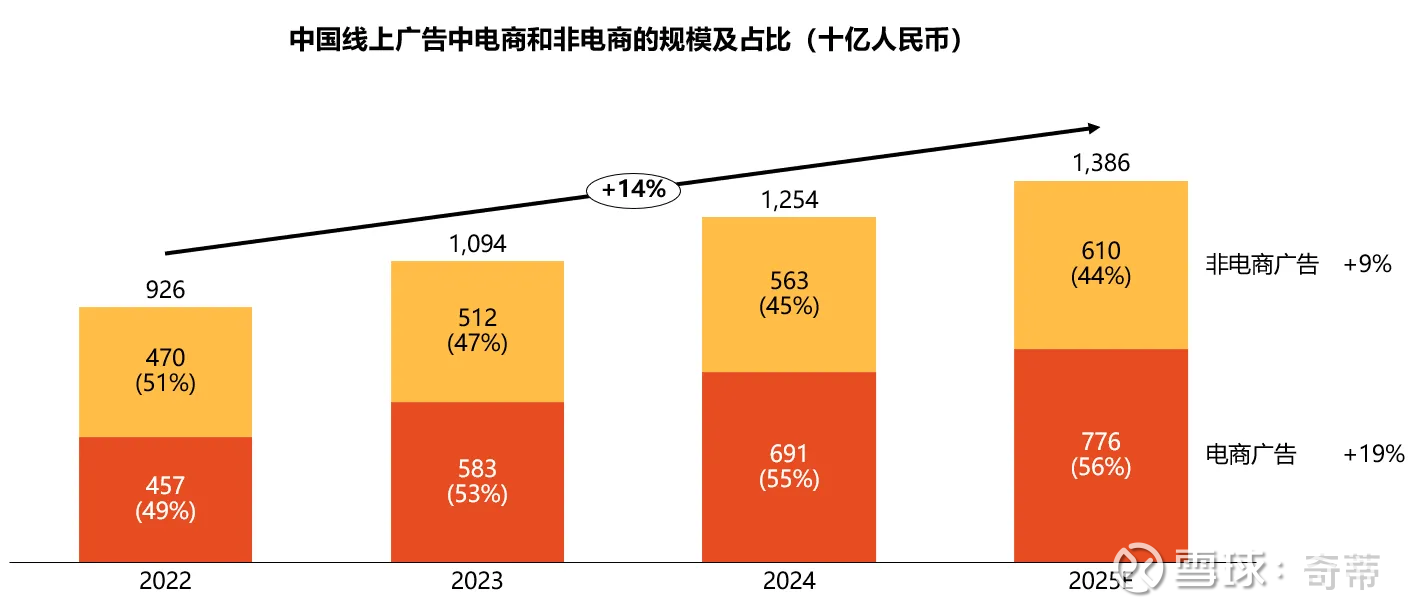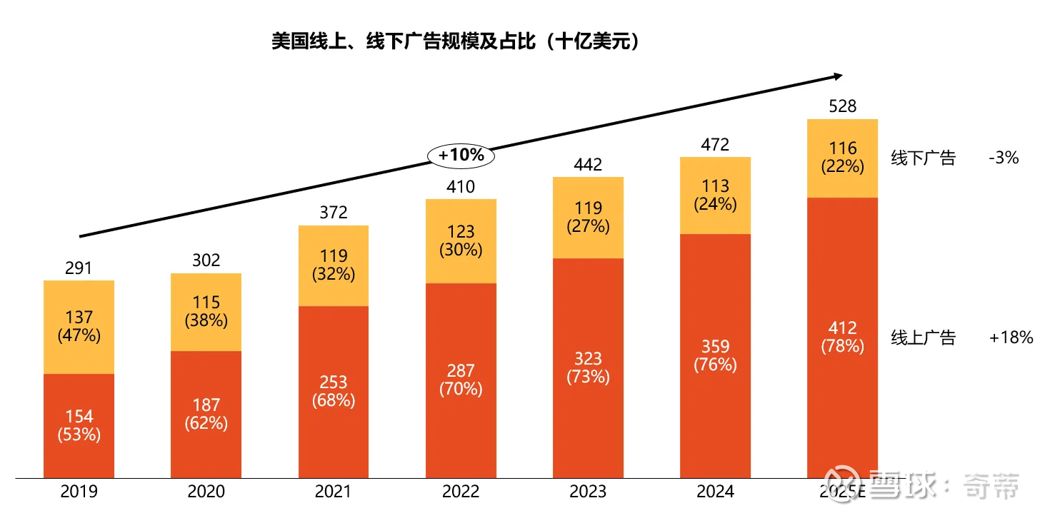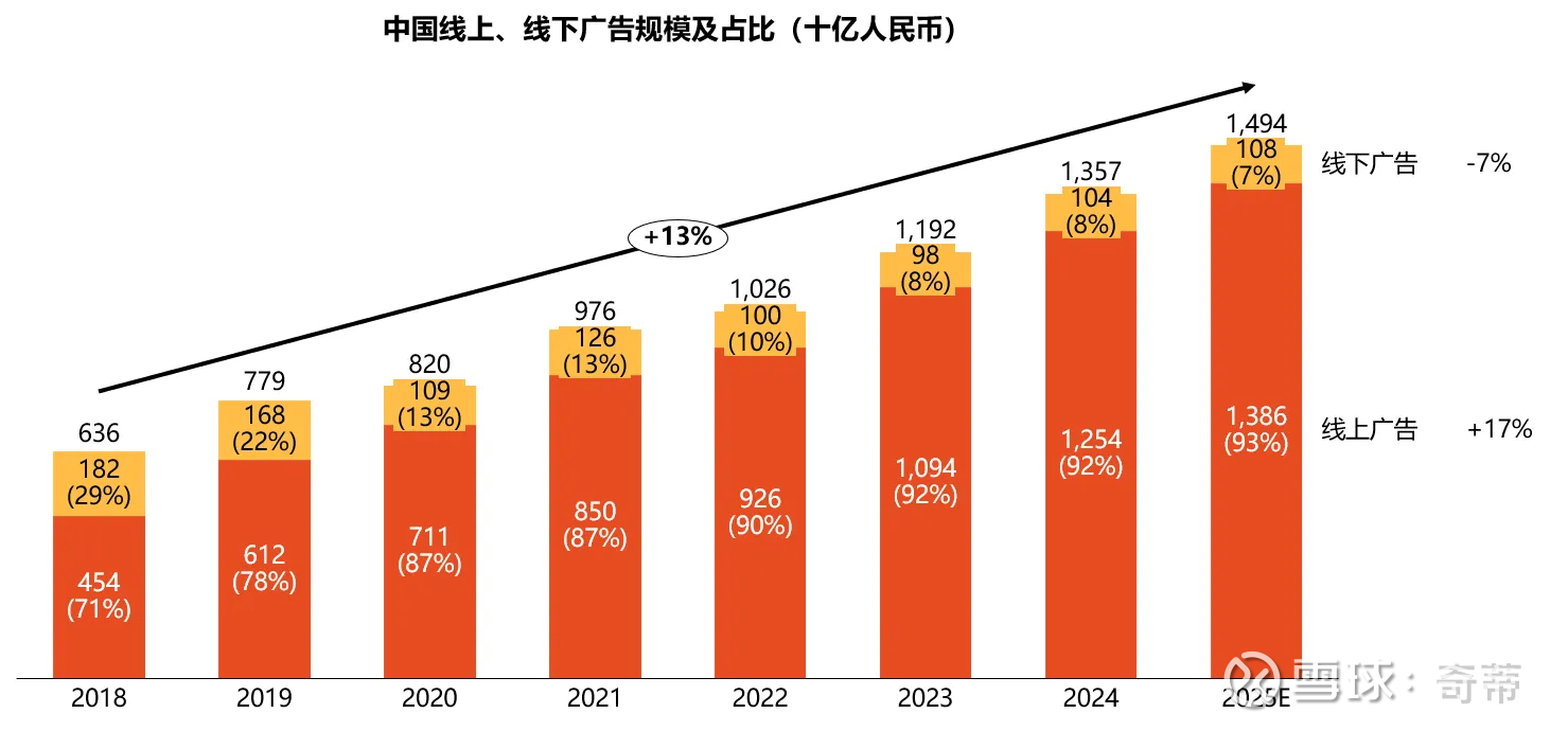 中国的广告基本=线上广告,2025年渗透率已经达到93%,即广告市场规模主要取决于互联网还能吃掉多少预算,和渗透率已经无关了