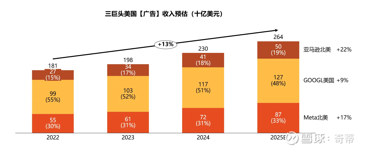 而看美国呢?我没有找到详细的全口径数据,我们不妨比较一下三大巨头之间的占比,因为这三巨头已经占了美国70%+的数字广告份额,亚马逊在三巨头广告收入离占比19%,即使考虑到沃尔玛等也存在“电商广告”,但电商平台的互联网广告肯定不会超过30%,无论如何远低于中国的56%