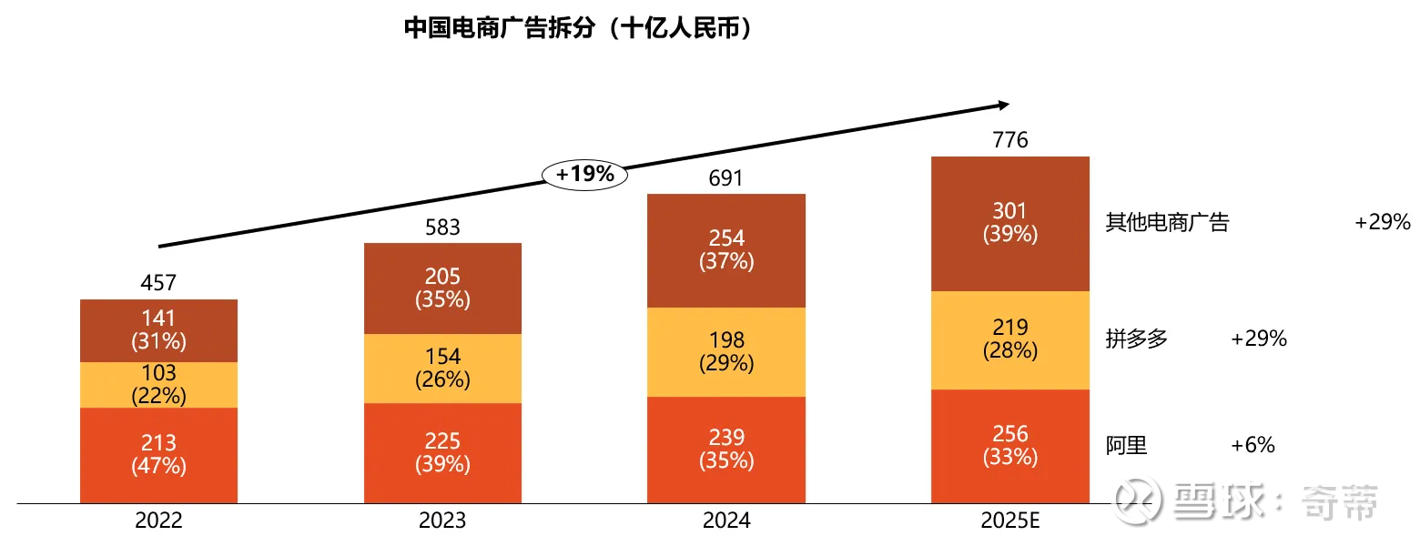 这组数据有足够的合理性,因为阿里和拼多多的电商广告基本是名牌,按照GroupM估算的电商广告总数,倒算出来占60%左右的电商广告份额,其他电商里主要就是字节(增长也很快在涨份额),但因为字节不是上市公司,这里就不再继续拆了