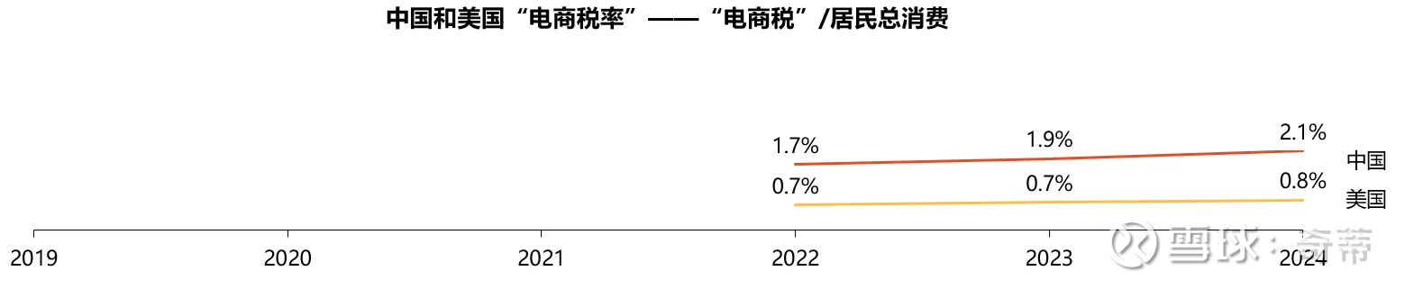 计算“电商税”在中美两国占居民最终消费的比例,中国和美国均逐步上升,但美国仅为1%,中国为2%