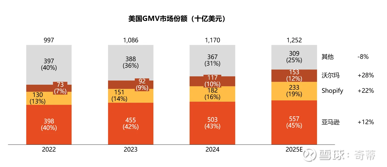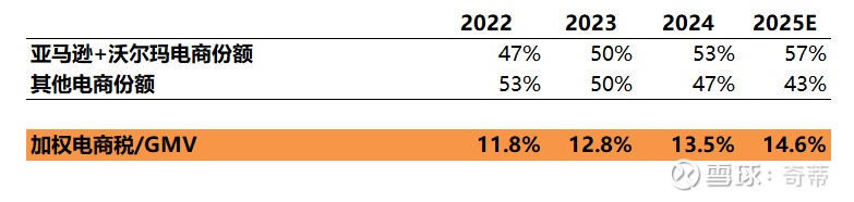 所以综合分析:根据亚马逊、沃尔玛这类公司和Shopify类自建站的相对GMV份额,估算美国整体“电商税”,所以整体美国电商税大概在GMV的15%左右(不含物流),且最近几年还在上升,主要是亚马逊在提Take rate