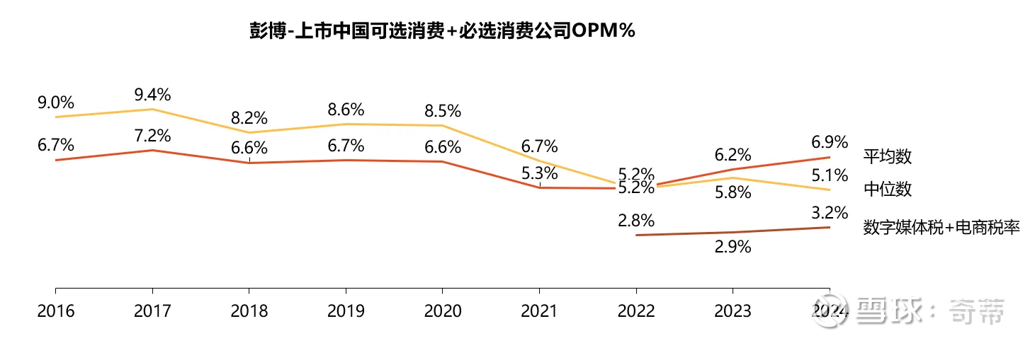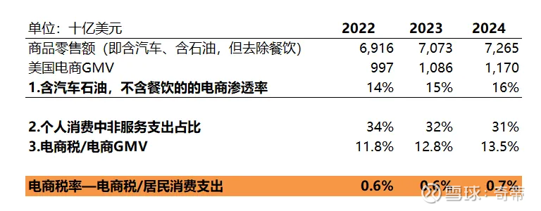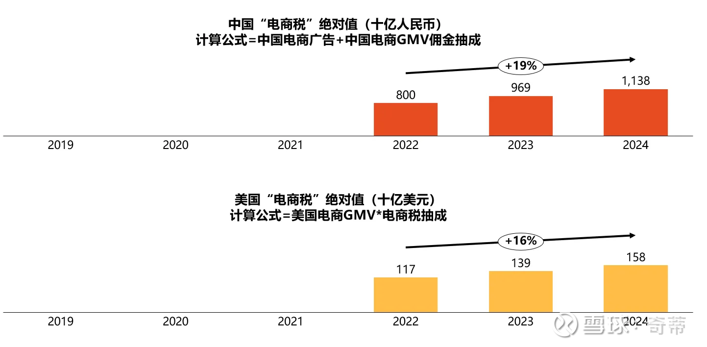 2.2再看中国:电商税=电商广告/GMV+佣金率(各家不太一样,阿里在整体GMV的1%,PDD不到0.5%,抖音显著更高),算出来整体的电商税在5%左右,但这个数据误导性很高,考虑到中国GMV退货率太高了,比如2024年全行业统计GMV在22万亿,国家统计局公布的网上零售额只有13万亿,大概估算电商口径是国家统计局170%,真实电商税可能在真实网上零售额的9%左右,还是比美国要少(注:我相信主要还是因为未支付和退货问题导致的GMV虚高,但电商成交和实物商品网上零售额的另一大区别是社零主要统计最终消费环节不包含批发转售、也不包含虚拟商品,这里是算个大概);在另外注意,抽的少不等于赚的少,盈利性是下一个问题,会在之后的文章中再分析)