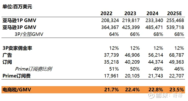 a.亚马逊:第三方电商税=(1.Prime订阅服务*第三方GMV占比[Prime对一方和三方几乎同时适用]+2.广告[对一方和三方同时适用]+3.第三方服务中的佣金部分[不含物流收费部分,因为和中国不可比])/第三方GMV,第一方电商税假设第三方电商税相等(第一方完全是自己在干零售,很难拆除“税”是多少,只是做一个代理指标),算出来电商税大概在GMV的23%