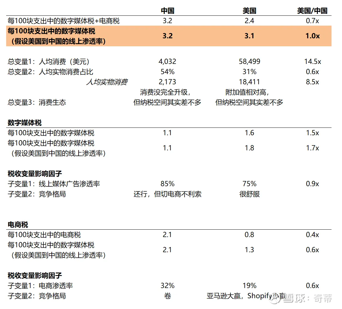 九、最终总结“数字媒体税”和“电商税”的中美差异,因为之前确实是揪线头式的分析,太冗长了。我最喜欢的发现有2点:1.如果美国的电商和数字广告渗透率达到中国水平,二者就都会从每100块居民消费中抽总共3块的“数字媒体税”+“电商税”,看起来像某种稳态,我本以为美国会更多,而且要知道,中国是在竞争格局显著差于美国的情况下达到的,考虑到竞争格局和监管环境,在互联网渗透率打满之后美国巨头能收到更多“数字税”我也不会感到惊讶,2.中国电商收的蛮多的,假设美国的“数字媒体税”中有30%是最终导流向电商的,美国居民也是100块消费中付1.8*30%+1.3=1.8,依然低于中国的2.1,更何况中国的“数字媒体税”也有很大比例是流向电商的…