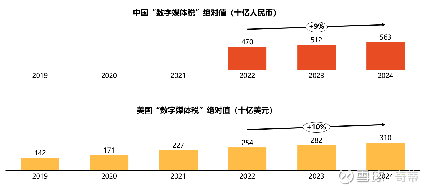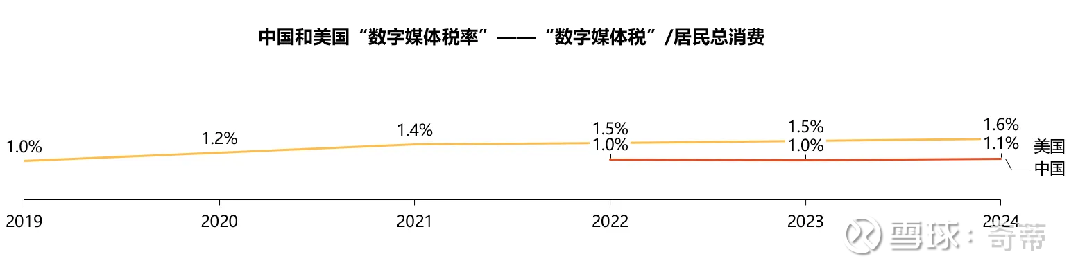 七、所以一个有意思的现象是,相对于居民最终消费收的“数字媒体税”+“电商税”,美国在2.4%,中国收3.2%左右,核心差异是,数字媒体税美国收1.6%中国收1.1%,电商税美国收0.8%中国收2.1%,让我们看看这是为什么?