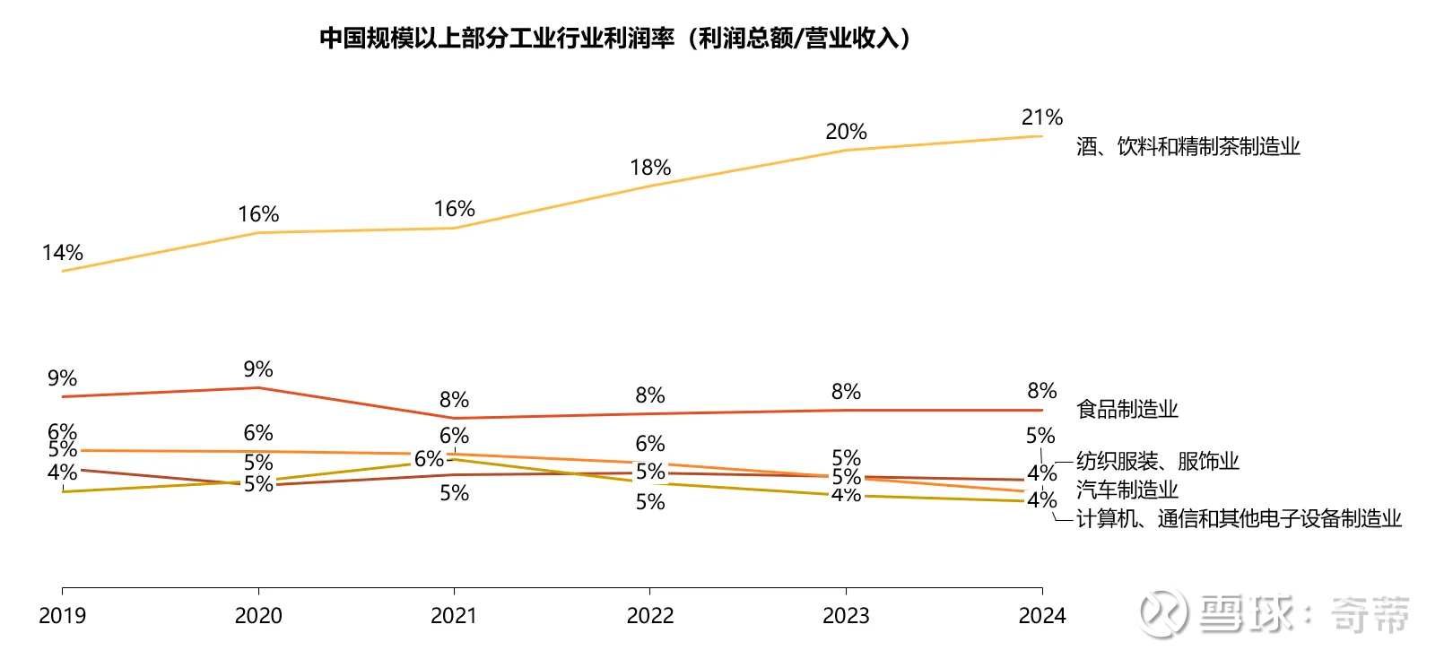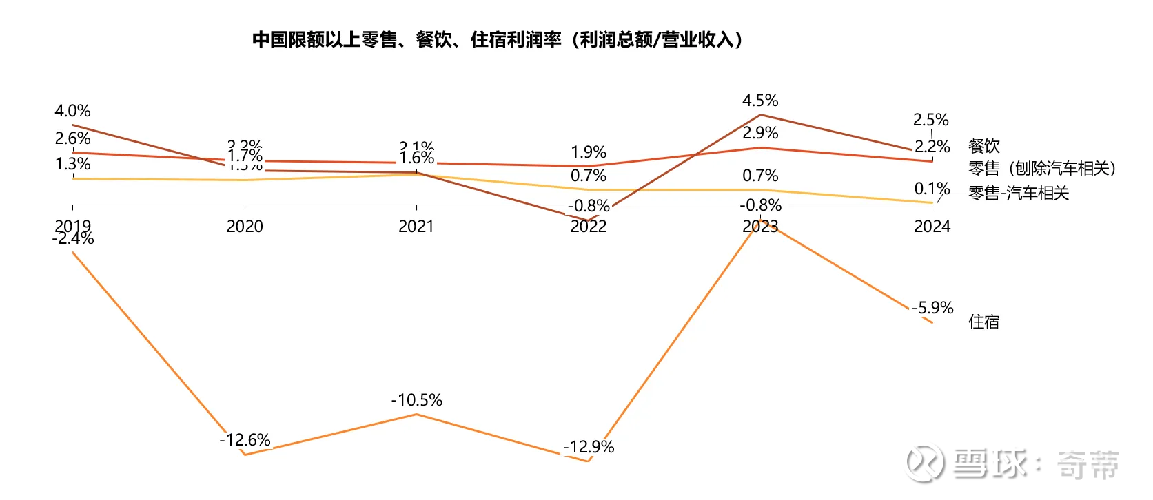 首先根据国家统计局的数字2019-2024年零售、餐饮行业利润率相对稳定,住宿因为疫情原因有波动,而工业中的食品、服装、汽车、电子设备、酒水饮料都相对稳定