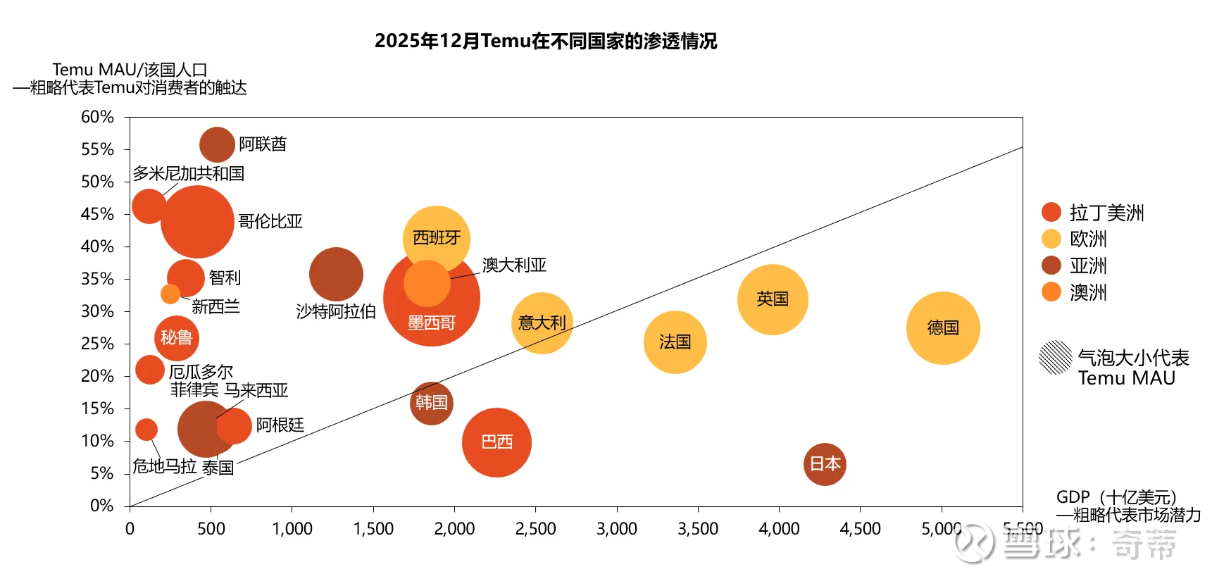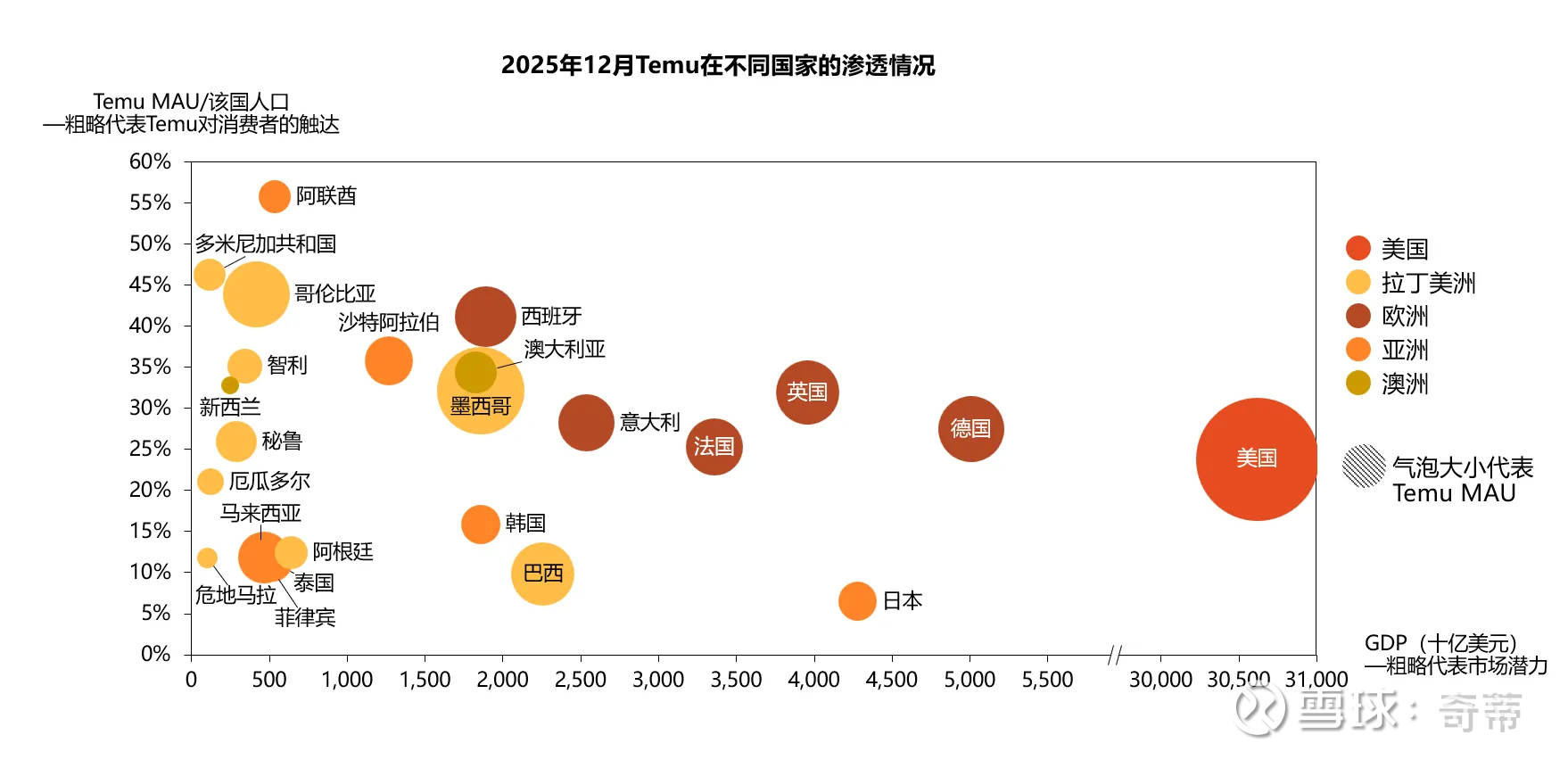 图片太小,简单解释一下,横轴是每个国家的GDP,越往右越大,用它粗略代表市场潜力(当然影响因素还有很多),纵轴是Temu MAU/该国人口,越往上越大,用它粗略代表Temu对特定国家的渗透率(注意这里只是讨论渗透了多少消费者,但其他的留存、频次、AOV都很重要),气泡大小是Temu的MAU绝对值。简而言之,点落在越往右,越往上是更好的