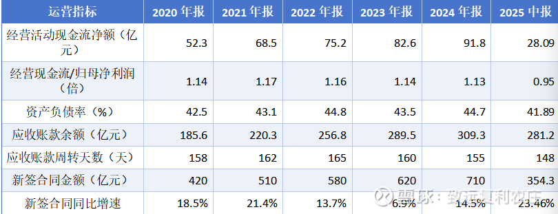 2017-2024年经营现金流净额从30亿增至91.8亿,连续8年为正,且现金流/净利润比值稳定在1.1-1.2倍,说明利润现金含量高;2025中报现金流28.09亿(2024中报为-16.53亿),同比大幅改善,因电网内项目回款提速(应收账款周转天数从2024年末155天降至148天)。