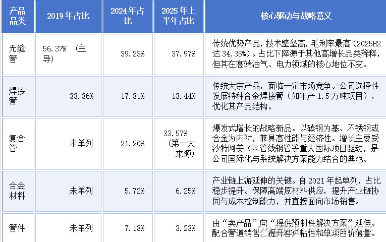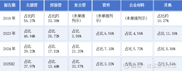 2.产品结构:从传统无缝管主导到“复合管”爆发引领的结构性重塑 公司的产品收入结构在过去六年发生了革命性变化,核心驱动力是双金属复合管的异军突起,带动了整个产品组合向更高附加值方向演进。