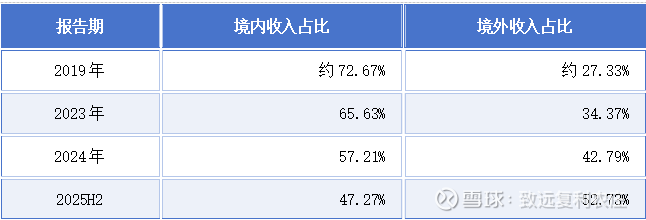 公司市场结构的国际化进程,是其业务分析中最具颠覆性的维度。境外收入占比从2019年的27.33%一路攀升至2025年上半年的52.73%,首次超过境内收入,实现了历史性跨越。
