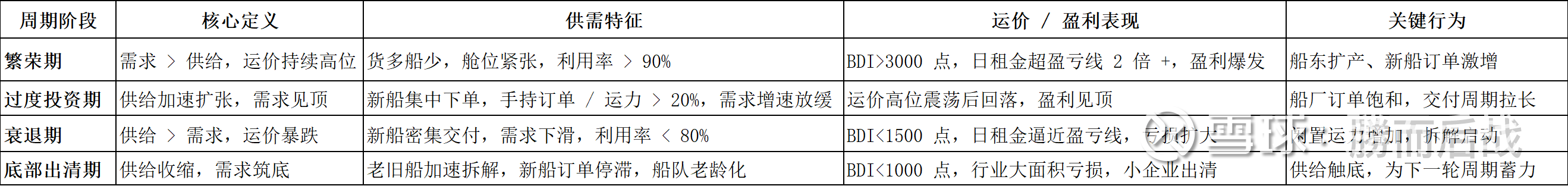 克拉克森将航运周期划分为繁荣、过度投资、衰退、底部出清四阶段,干散货周期本质是运力供给与大宗商品海运需求的错配博弈。