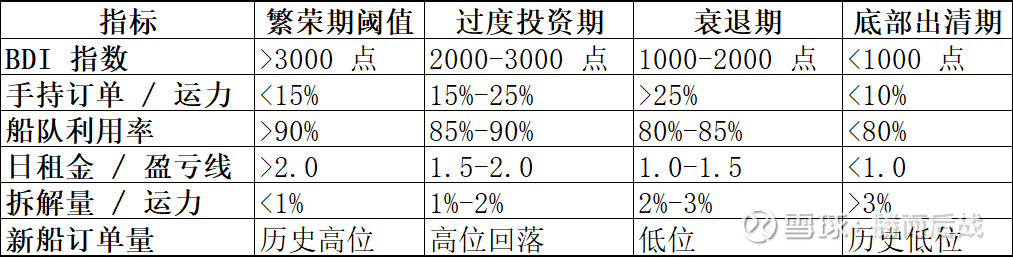 指标:BDI 回升至 1500-2000 点;手持订单 / 运力 < 10%;新船订单温和增长,利用率回升至 85%+。